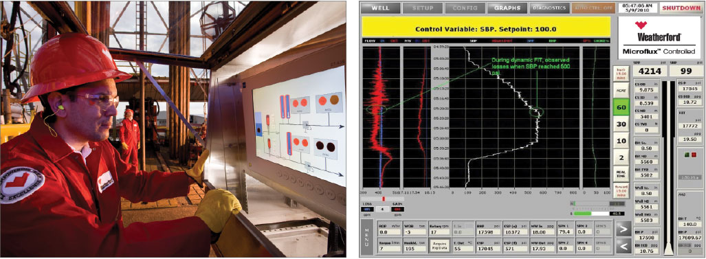 Left and right: A Weatherford employee interprets data from the Microflux Control system that combines closed-loop technology with sophisticated, proprietary data acquisition and computer-controlled equipment to enhance rig safety and drilling efficiency. With the goal of removing people from hazardous tasks on the drill floor and reducing risk in surface operations, industry experts are seeing an increasing focus on closed-loop control systems, such as automated MPD, to optimize drilling operations in high-risk or complex wells.