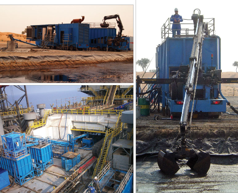 Right and left, top: TWMA's RotoTruck, onsite in Dubai, removes cuttings and waste from storage sites and puts them through a thermal treatment process. Left, bottom: TWMA's TCC RotoMill equipment (in blue), along with a cuttings collection and distribution system, separates hydrocarbon-contaminated drill cuttings into constituent parts of water, oil and solids on a platform rig. The system can process up to 9 tons of cuttings per hour at the rig site, resulting in cuttings that are environmentally safe to be disposed of onsite.